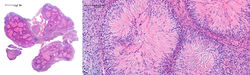 Histológicamente se observan depósitos filamentosos encerrados por columnas paraqueratósicas dentro del ostium del folículo parcialmente necrótico (F2-4). Bajo la evaluación microscópica en alto poder se observan estructuras cristalinas con aspecto filamentoso (F5-6). El material puede ser birrefringente con luz polarizada (F7) (1-2).
